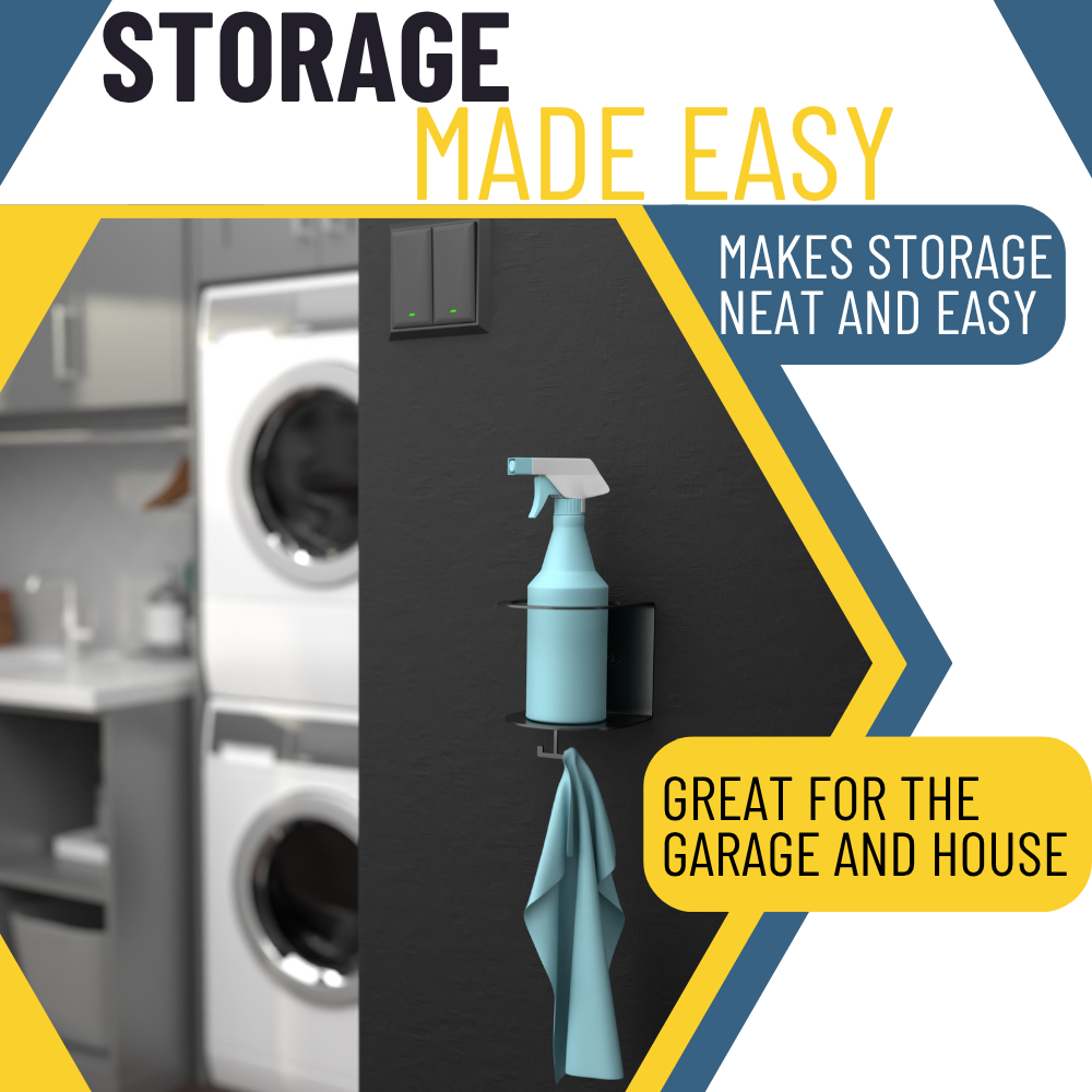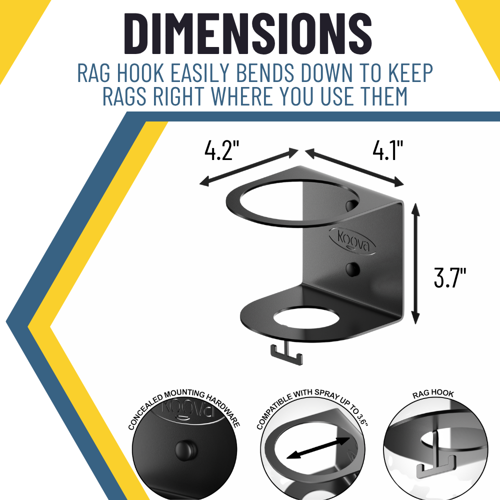 Take control of your workspace with the upgraded Koova All-Purpose Spray Bottle Holder, now featuring a convenient fold-down hook for even more utility. Designed for durability and ease of use, this wall-mounted organizer secures your most-used spray bottles and adds a handy spot for your rags, towels, or gloves—right where you need them. Built in the USA from heavy-duty powder-coated steel, it’s a space-saving storage solution made to last a lifetime in your garage, kitchen, utility room, or detailing bay. Whether you’re tackling auto detailing, cleaning, gardening, or crafting, the new integrated hook bends downward at a 90-degree angle for hanging cloths and gear—giving you quick access and a tidier workspace. Mount it once, use it forever.