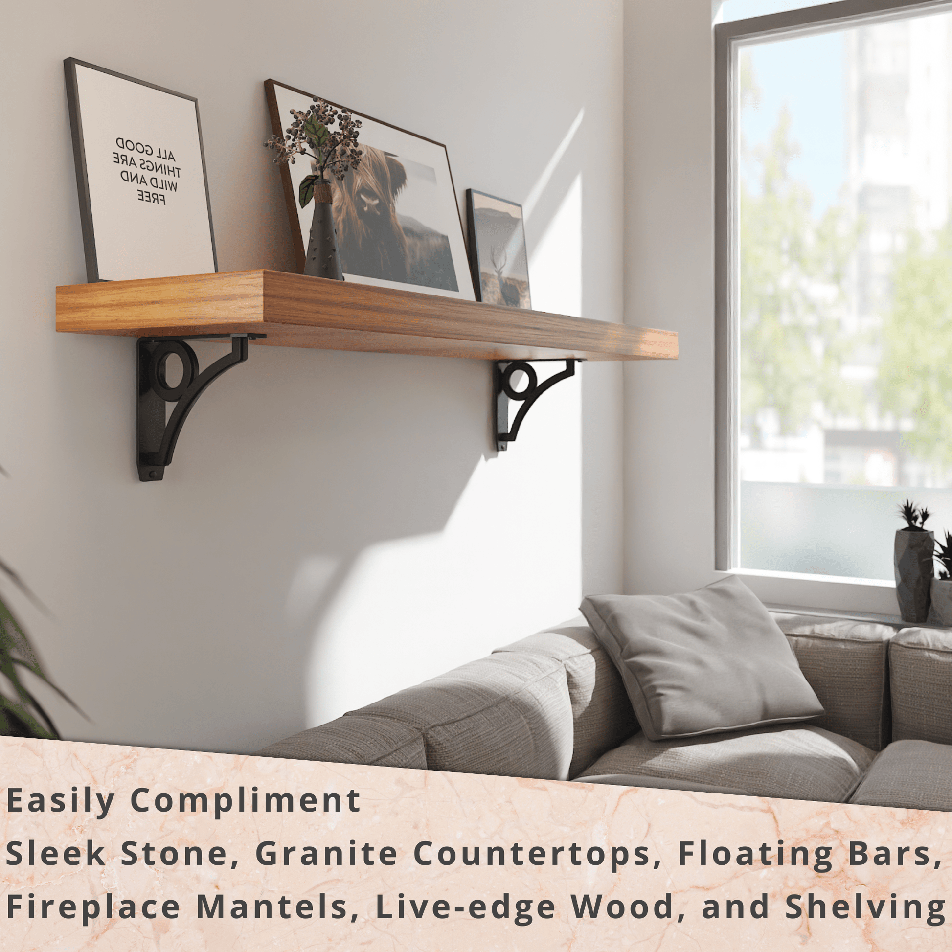 Only the best: Unlike inferior shelving brackets, Park Circle premium mounting brackets from STARBY are handmade right here in the USA from the highest American steel. We researched common complaints about other brackets for shelves and carefully crafted one of the best heavy duty shelf brackets on the market. With meticulous craftsmanship and unwavering commitment to quality, STARBY’s wall shelf brackets are second to none. As practical as you: We’ve thought of everything. Here’s what makes our decorative shelf brackets special: ● Ornate: Park Circle shelf brackets & supports feature an intricate nature inspired design for a rustic decor upgrade. ● Discreet: each premium shelf support has hidden welds for a sleeker appearance. ● Pre drilled: our modern shelf brackets come with pre drilled holes for faster mounting. ● Heavy duty: STARBY black shelf brackets support over a whopping 500 lbs of weight. ● Clever packing: these shelf support brackets arrive damage free in study packaging. An ultra versatile solution: More than simply just metal shelf brackets, Park Circle supports from STARBY also make ideal corbels for countertops and even fireplace mantel mounting brackets. And with a black powder coat finish, you can get the appearance of cast iron shelf brackets for a fraction of the weight. Easy installation: Say goodbye to wooden shelf brackets that are difficult to install. STARBY black shelf brackets include all necessary screws and even come with decorative screw covers for an upgraded appearance. Lifetime warranty: Our heavy duty shelf supports are covered by STARBY’s lifetime warranty. If you don’t love your heavy duty shelf supports for any reason, simply let us know what the issue is with your shelf hardware and we’ll do whatever we can to make things right. No fuss, no tricks, no fine print; just incredible customer service.
